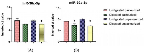 Inverted Ct Values of miR-30c-5p (A) and miR-92a-3p (B) in polyfloral honey and its digest. Bars are the means of 3 independent extractions. * Significantly lower at p < 0.05 (independent t-test). miR-30c-5p—unpasteurized, p = 0.011 (combined, p = 0.008). miR-92a-3p—pasteurized, p = 0.038; unpasteurized, p = 0.005 (combined, p < 0.001).