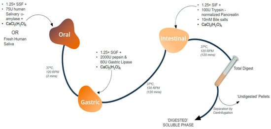 - Brodkorb, A.; Egger, L.; Alminger, M.; Alvito, P.; Assunção, R.; Ballance, S.; Bohn, T.; Bourlieu-Lacanal, C.; Boutrou, R.; Carrière, F.; et al. INFOGEST static in vitro simulation of gastrointestinal food digestion. Nat. Protoc. 2019, 14, 991–1014. [Google Scholar] [CrossRef]