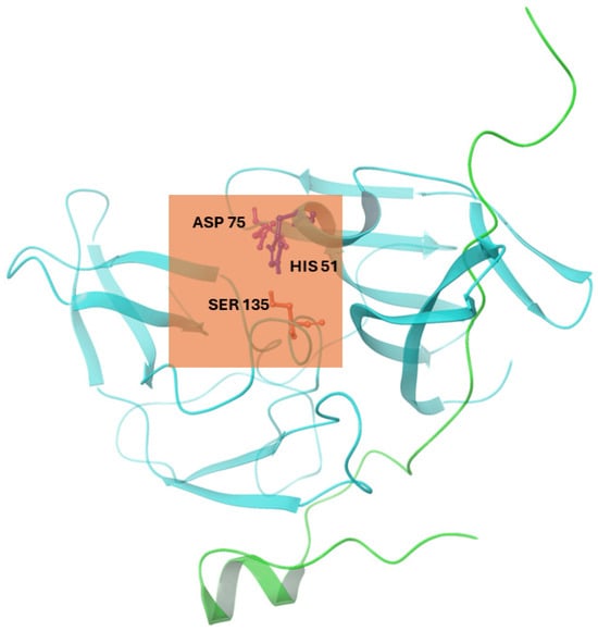 Cartoon representation of the NS2b-NS3 protease (PDB ID: 2FOM) showing the active site grid (orange box) and the catalytic triad residues (ASP 75, HIS 51, and SER 135). Illustration was generated using Schrodinger Maestro [12].