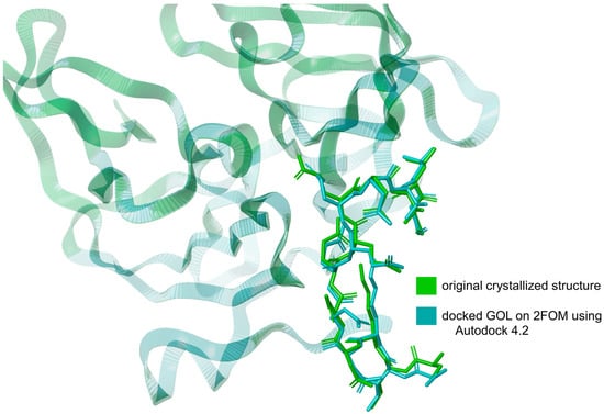 Overlay of the docked glycerol (GOL) structure on 2FOM using Autodock 4.2 and the original crystallized GOL structure from 2FOM. Illustration was generated using Schrodinger Maestro [12].
