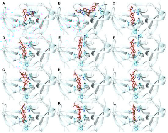 Best docking conformations of top ten ligand–protein complex based on binding energy. Reference ligands: (A) IDE; (B) NIN. Candidate ligands: (C) VER; (D) ISO; (E) ETI; (F) TOM; (G) CAR; (H) HYD; (I) CHL; (J) ECL; (K) CYC; (L) HON. Illustrations were generated using UCSF Chimera 1.16 [34].