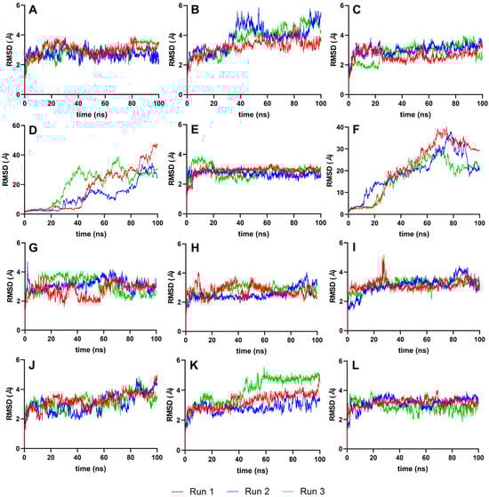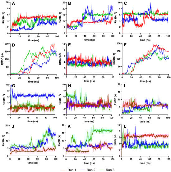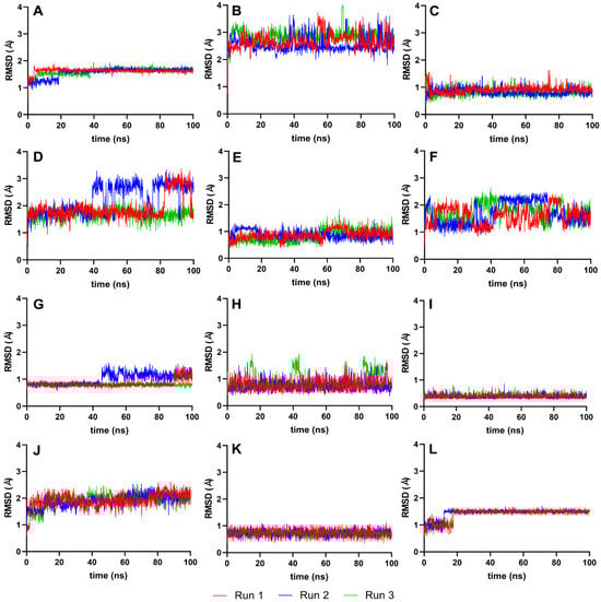 Complex-RMSD of the top ten complexes and two references at 100 ns. Reference ligands: (A) IDE; (B) NIN. Candidate ligands: (C) VER; (D) ISO; (E) ETI; (F) TOM; (G) CAR; (H) HYD; (I) CHL; (J) ECL; (K) CYC; (L) HON. Graphs were plotted using GraphPad Prism 8.2.1 (GraphPad Software, San Diego, CA, USA, www.graphpad.com).