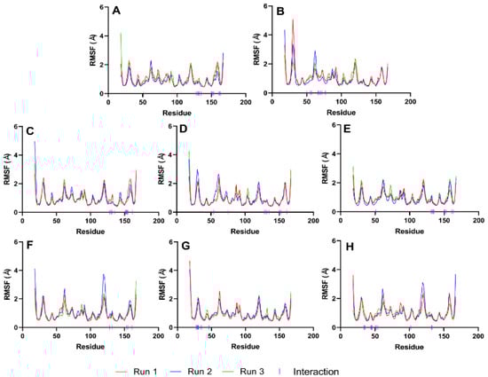 RMSF graphs of NS2b-NS3 Protease docked with the reference and best candidate ligands during the last 10 ns of MD simulation. Residues with interactions were denoted by a purple vertical line (|) on the x-axis. Reference ligands: (A) IDE; (B) NIN. Best candidate ligands: (C) VER; (D) ETI; (E) HYD; (F) CHL; (G) ECL; (H) CYC. Graphs were plotted using GraphPad Prism 8.2.1 (GraphPad Software, San Diego, CA, USA, www.graphpad.com).