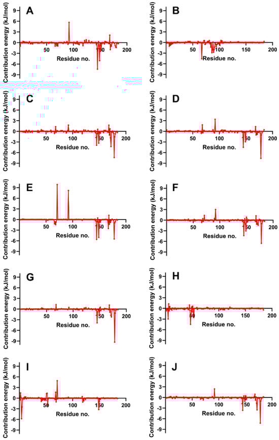 Binding energy decomposition on complexes with the highest MM/PBSA energies. Reference ligands: (A) IDE; (B) NIN. Candidate ligands: (C) VER; (D) ETI; (E) CAR; (F) HYD; (G) CHL; (H) ECL; (I) CYC; (J) HON. Graphs were plotted using GraphPad Prism 8.2.1 (GraphPad Software, San Diego, CA, USA, www.graphpad.com).