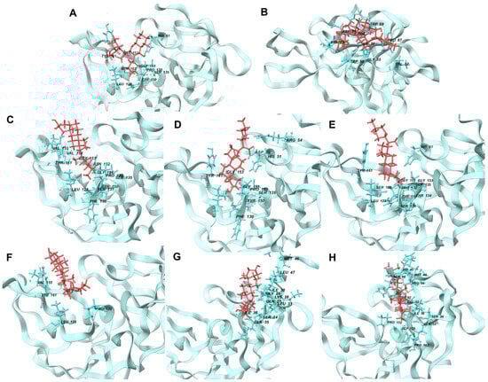 Illustration of interacting residues from 2FOM during the last 10 ns of MD simulation for the top six ligands and references. Reference ligands: (A) IDE; (B) NIN. Candidate ligands: (C) HYD; (D) VER; (E) ETI; (F) CHL; (G) CYC; (H) ECL. Illustrations were generated using Schrodinger Maestro [12].