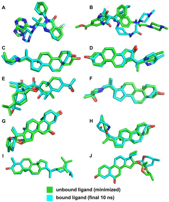 3D structures of ligands for both unbound and bound states. Reference ligands: (A) IDE; (B) NIN. Candidate ligands: (C) VER; (D) ETI; (E) CAR; (F) HYD; (G) CHL; (H) ECL; (I) CYC; (J) HON. Illustrations were generated using PyMol 2.5.4 [46].