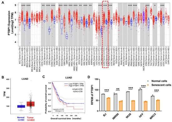 Expression levels of PTBP1 in LUAD and senescent cells. (A) The expression of PTBP1 among normal and tumor tissues including LUAD from TIMER. The expression of PTBP1 in LUAD is marked by a red box. The red dots and blue dots within the rectangle represent tumor tissues and normal tissues, respectively, while the purple dots represent metastatic tissues. (B) Changes in mRNA levels of PTBP1 in LUAD and matched normal tissues derived from GEPIA [34]. (C) Results from GEPIA showed that higher mRNA levels of PTBP1 were associated with lower survival rates in LUAD patients. The solid line depicts the survival curve, and the dotted line represents the 95% confidence interval. A Log-rank test with a p-value < 0.05 is considered to indicate a statistically significant difference. (D) Decreased mRNA levels of PTBP1 in five human senescent models compared to younger ones (* p < 0.05, ** p < 0.01, *** p < 0.001, t-test).