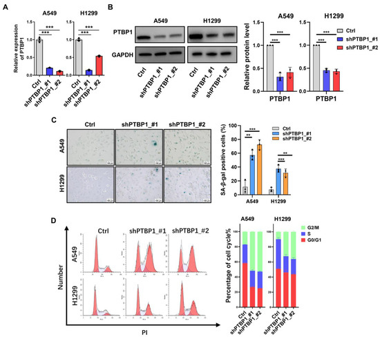 Knockdown of PTBP1 induces senescence and cell cycle arrest in LUAD cells. PTBP1 expression was validated by RT-qPCR (A) and Western blotting (B) in A549 and H1299 cells transfected with two different shRNAs (shPTBP1_#1 and shPTBP1_#2), with GAPDH serving as the internal control for both mRNA and protein levels. (C) SA-β-Gal staining in A549 and H1299 cells with PTBP1 knockdown. (D) Cell cycle detection for A549 and H1299 cells with PTBP1 knockdown. In the graph on the left side, red represents cells in the G1 and G2 phases. (** p < 0.01, *** p < 0.001, t-test).