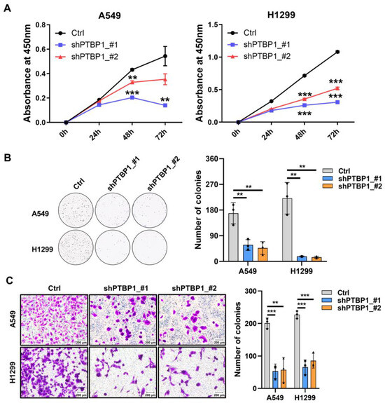 PTBP1 knockdown inhibits the proliferation and migration of LUAD cells. (A) Cell proliferation rate of A549 and H1299 cells with PTBP1 knockdown. (B) Colony formation capacity of A549 and H1299 cells with PTBP1 knockdown. (C) Cell migration ability in A549 and H1299 cells with PTBP1 knockdown (** p < 0.01, *** p < 0.001, t-test).