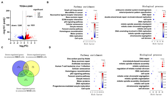 Functional annotation of PTBP1-related genes in LUAD and senescence. (A) Profile of differentially expressed genes (DEGs) based on the median level of PTBP1 mRNA, as presented in volcano plots. LUAD patients from the TCGA-LUAD dataset were stratified into PTBP1-high and PTBP1-low groups. The dotted lines indicates the threshold for |log fold change (FC)| ≥ 0.5 and adjusted p-value < 0.05. (B) KEGG pathway analysis and Gene Ontology (GO) term enrichment for genes upregulated by PTBP1 in TCGA-LUAD dataset. (C) Venn diagram demonstrating the intersections of downregulated genes across replicative senescence cell lines of three human embryonic lung fibroblasts, MRC5, IMR90, and WI38. (D) KEGG pathway analysis and Gene Ontology (GO) term enrichment for overlapping genes across three replicative senescence cell lines.