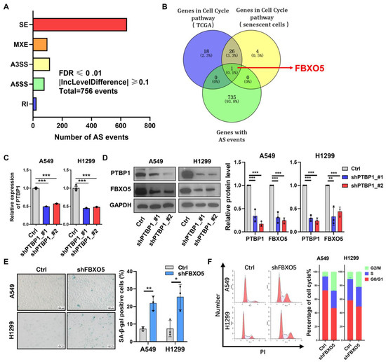PTBP1 regulates the expression of cell-cycle-related gene FBXO5 via alternative splicing. (A) Statistics for differential events of alternative splicing following PTBP1 knockdown in A549 cells (FDR ≤ 0.01, |IncLevelDifference| ≥ 0.1). (B) Venn diagram showing overlapping genes between differential differentially spliced genes and cell-cycle-related genes after PTBP1 knockdown in A549 cells. (C) RT-qPCR analysis for mRNA level of FBXO5 after PTBP1 depletion in A549 and H1299 cells. (D) Western blot analysis of FBXO5 after PTBP1 knockdown in A549 and H1299 cells. (E) SA-β-Gal staining for A549 and H1299 cells with FBXO5 knockdown. (F) Cell cycle analysis for A549 and H1299 cells with FBXO5 knockdown. In the graph on the left side, red represents cells in the G1 and G2 phases. (* p < 0.05, ** p < 0.01, *** p < 0.001, t-test).