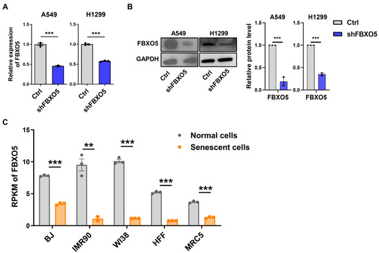 FBXO5 shows downregulation in senescent cells. FBXO5 expression was validated in A549 and H1299 cells transfected with shFBXO5 by RT-qPCR (A) and Western blotting (B). GAPDH served as the internal control for both mRNA and protein. (C) Decrease in FBXO5 mRNA in five human senescent models compared to younger ones (** p < 0.01, *** p < 0.001, t-test).