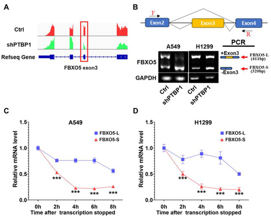 Knockdown of PTBP1 promotes exon skipping and degradation of FBXO5. (A) RNA-seq read coverage plots of the gene FBXO5 in A549 cells after PTBP1 depletion. Exon numbers and transcript identification numbers of FBXO5 in the RefSeq annotation are shown. (B) RT-PCR was performed to analyze exon 3 skipping of FBXO5 upon PTBP1 knockdown in LUAD cells. Primers designed against exon 2 and exon 4 of FBXO5 are shown above in schematic representation of FBXO5 splicing variants. Schematic of alternative spliced isoform structures for each PCR product is shown next to the gel image. A higher band intensity of PCR products indicates a higher production of the specific transcript isoform. GAPDH served as the endogenous control. (C,D) RNA stability assay in A549 (C) and H1299 (D) cells (*** p < 0.001, t-test).
