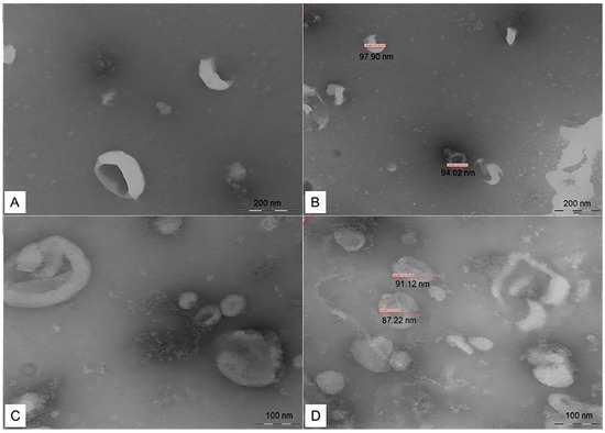 Transmission electron microscopy image of serum EVs isolated from bitches. The particles have spherical/oval shape (A,C) and measured between 30 and 150 nm (B,D).