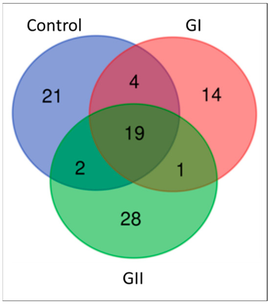 Venn diagram presenting the proteins found in control group, GI, and GII.