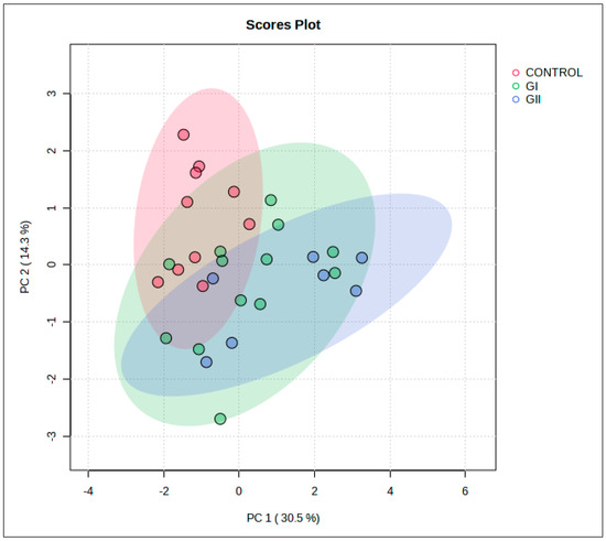Principal component analysis (PCA) of the multivariate statistical from the control group, GI, and GII.
