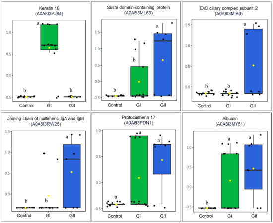Differential abundance of proteins in control group, GI, and GII. Different letters (a and b) indicate significant statistical difference (ANOVA–Fisher’s LSD test, FDR < 0.05.). ab Different letters indicate statistical difference (p < 0.05).