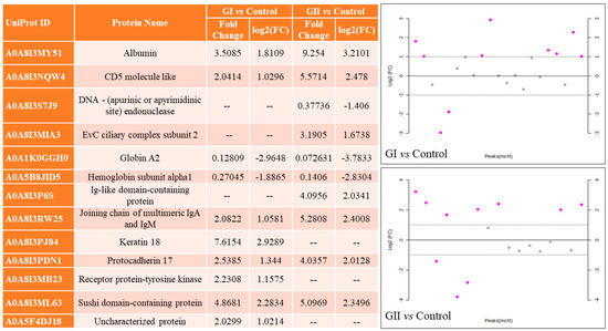 Results of the fold change analysis for comparing GI or GII vs. control. Purple dots indicate proteins that were upregulated or downregulated.