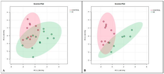 Principal component analysis (PCA) for GI vs. control (A; PC1 + PC2 = 45.4) and GII vs. control (B; PC1 + PC2 = 57.4).