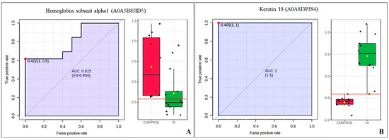 ROC curve of the GI vs. control group from bitches with mammary tumors. (A) Hemoglobin subunit alpha1 (A0A5B8JID5). (B) Keratin 18 (A0A8I3PJ84).