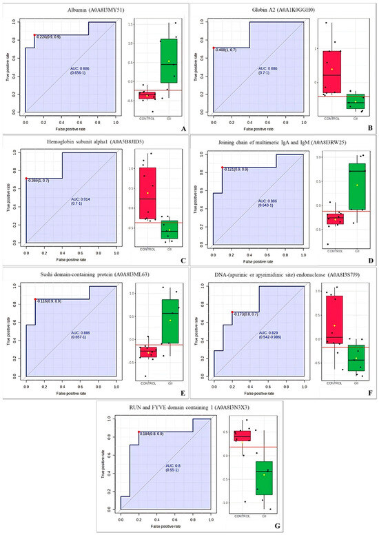 ROC curve of the control group vs. GII from bitches with mammary tumors. (A) Albumin (A0A8I3MY51). (B) Globin A2 (A0A1K0GGH0). (C) Hemoglobin subunit alpha1 (A0A5B8JID5). (D) Joining chain of multimeric IgA and IgM (A0A8I3RW25). (E) Sushi domain-containing protein (A0A8I3ML63). (F) DNA-(apurinic or apyrimidinic site) endonuclease (A0A8I3S7J9). (G) RUN and FYVE domain containing 1 (A0A8I3N3X3).