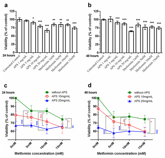 Synergistic effect of APS and metformin on A549 cell viability. A549 cell viability under the treatment of (a,b) APS/metformin alone for (a) 24 h and (b) for 48 h. (c,d) APS in combination with different concentrations of metformin after treatment of (c) 24 h and (d) 48 h. The combination group significantly decreased compared to using either APS or metformin alone. All the results are representative of at least three independent experiments. (Error bars = mean ± S.E.M. Asterisks mark samples significantly different from control group with (*) p < 0.05; (**) with p < 0.01; (***) with p < 0.001).