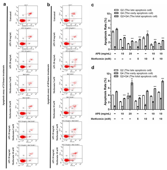 The apoptotic effect on A549 cells of APS, metformin detected by flow cytometry with annexin V-FITC/PI dual staining: (a,c) A549 cells treated for 24 h and (b,d) for 48 h. (Error bars = mean ± S.E.M. Asterisks mark samples significantly different from control group with (**) with p < 0.01; (***) with p < 0.001).
