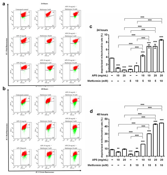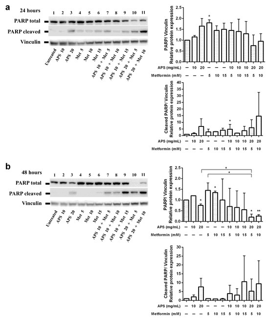 Apoptosis assays were performed to verify the cellular death mechanism. The cells were treated with indicated treatments for different durations and then analyzed through flow cytometry with annexin V/PI double staining. From Figure 2d, it can be inferred that apoptotic cells significantly increased after 48 h treatment compared with the control group. Furthermore, as shown in Figure 3, mitochondrial depolarization was observed in all treatment groups after 24 h treatment. However, the effect was sustained until 48 h only in the combination treatment group. As shown in Figure 4, the upregulation of cleaved PARP was seen in a high concentration of APS and metformin after 24 h treatment. The sustained effect was also observed in the combination group after 48 h.