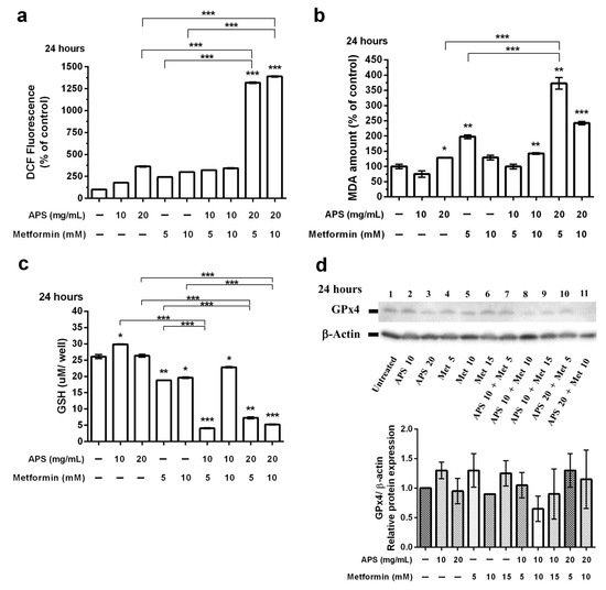 The ROS levels were measured after 24 h (Figure 5a) of the indicated treatment. ROS accumulation increased significantly with the combination treatment, namely 20 mg/mL of APS combined with 5 and 10 mM of metformin. Additionally, MDA levels increased with the treatment of APS, metformin, and their combination after 24 h (Figure 5b). However, the dose-dependent effect was not observed.