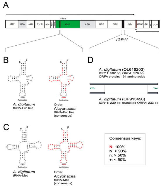 The following supporting information can be downloaded at: https://www.mdpi.com/article/10.3390/cimb46080479/s1, Figure S1: Secondary structure of putative tRNAPro from representative mitogenomes of twelve families within the order Alcyonacea; Figure S2: Sequential features of the intergenic region 11 (IGR-11) in A. digitatum; Table S1: Annotation of A. digitatum (Nor-1) complete mitochondrial genome; Table S2: List of mitogenome sequences (order Alcyonacea) included in the tRNA consensus structure analyses.