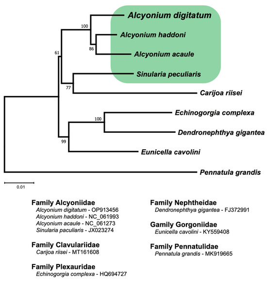 An alignment of 11,700 nucleotide positions representing all 13 concatenated OxPhos PCGs was used to reconstruct the mitogenome phylogeny of nine species representing six families of octocorals. The sea pen Pennatula grandis (order Pennatulacea) was used as the outgroup in the analysis. SSU and LSU rRNA genes and MutS gene sequences were excluded from the alignment due to frequent indels among the octocoral mitochondrial genomes assessed. The resulting phylogenetic tree (Figure 2) showed that the A. digitatum isolates cluster with high confidence (bootstrap value 100%) to the congeneric A. acaule (endemic to the Mediterranean Sea) and A. haddoni (endemic to the Southeast Pacific Ocean).
