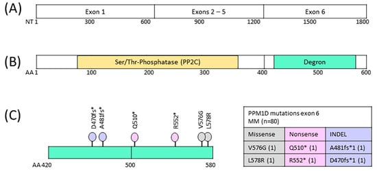 - Husby, S.; Hjermind Justesen, E.; Grønbæk, K. Protein Phosphatase, Mg2+/Mn2+-Dependent 1D (PPM1D) Mutations in Haematological Cancer. Br. J. Haematol. 2021, 192, 697–705. [Google Scholar] [CrossRef] [PubMed]