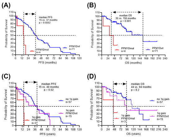 The survival time from initial diagnosis to disease progression and death varied significantly in the PPM1D wild-type versus PPM1D-mutated myeloma patients. In the PPM1D wild-type subgroup (n = 71), disease progressed in 49 patients (69%) with a median progression-free survival of 37 months after first ICT, and 19 patients (27%) died with a median survival of 156 months after first ICT. In the PPM1D-mutated subgroup (n = 4), disease progressed in all patients (100%) with a median progression-free survival of 15 months, and death occurred in three patients (75%) with a median survival of 36 months after first ASCT. Survival times were significantly reduced in PPM1Dmut population (PFS median 15 vs. 37 months, p = 0.0002; OS median 36 vs. 156 months, p = 0.001) (Figure 2A,B). As there was a potential association of PPM1D gene mutation with cytogenetic aberration +1q, the survival times were analyzed in patients stratified according to chromosome 1q status. There was no significant difference in the median survival times in patients with chromosome 1q gain compared to normal chromosome 1. However, within the myeloma patients with 1q gain, median survival time was reduced in the PPM1Dmut population compared to PPM1Dwt (PFS 15 vs. 40 months, p = 0.02; OS 44 vs. 94 months, p = 0.2) (Figure 2C,D).
