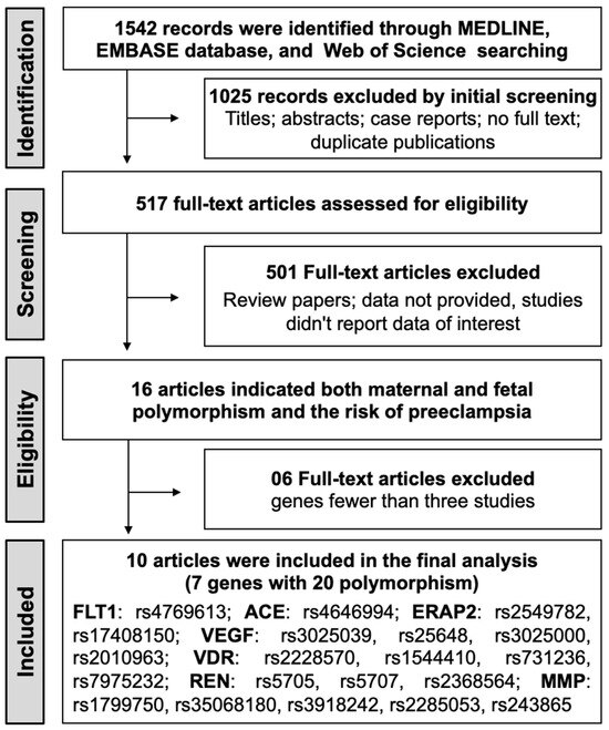 The initial search identified 1542 potential records from electronic databases, and 517 full-text articles were evaluated for eligibility. Among these, 15 articles provided data on both maternal and fetal polymorphisms in relation to preeclampsia risk. Genes implicated in a minimum of three studies were selected, resulting in the exclusion of five articles. Consequently, 10 observational studies that satisfied the inclusion criteria were included in the meta-analysis [32,36,37,38,39,41,42,43,44,45]. The detailed steps of the literature selection process are shown in Figure 1.