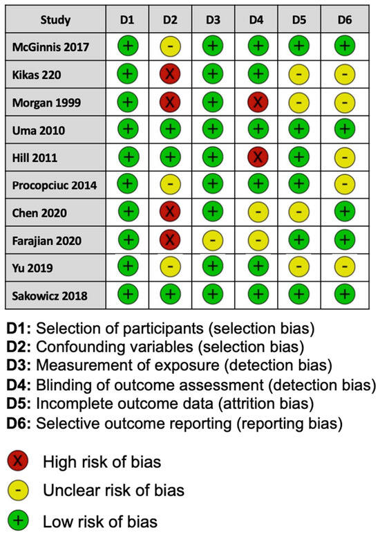 For the risk of bias for each study assessed, two of the ten studies included were considered to be at a low risk of bias, and three studies showed a high risk of bias. Five studies reported methods that raised concerns about the risk of bias (Figure 2).