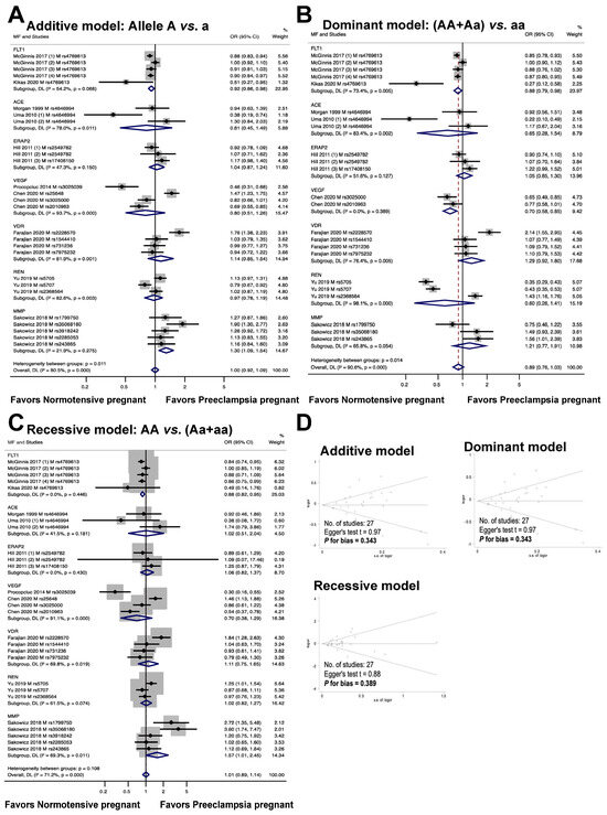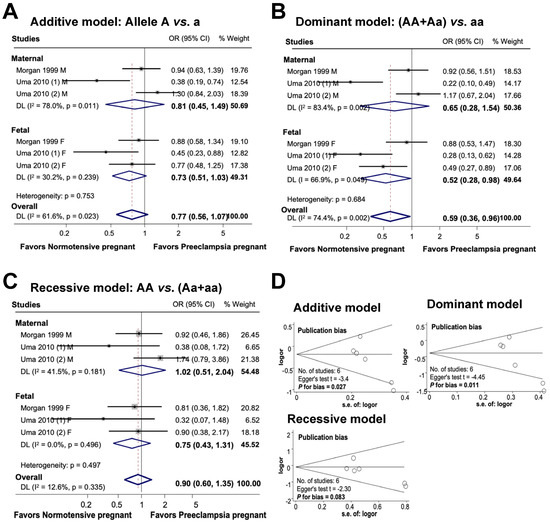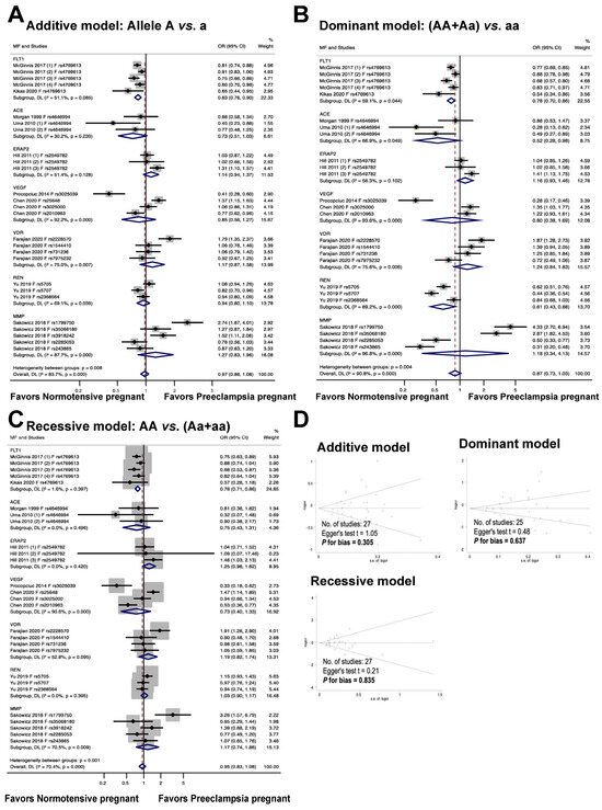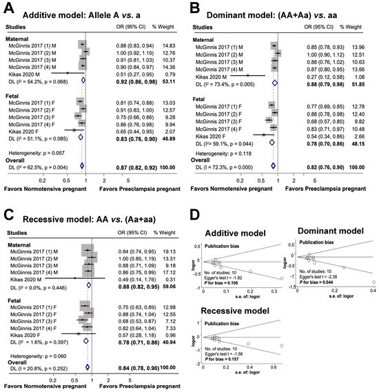 Association between maternal genetic variants and preeclampsia (A–C). Forest plot of maternal polymorphisms and preeclampsia in an additive model (A), dominant model (B), and recessive model (C). Funnel plot evaluating publication bias among studies included in the meta-analysis (D).