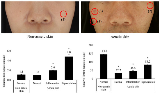 Comparative analysis of IL8 and TIMP2 expression in normal skin, acne-affected, inflamed, and pigmented sites. IL8 and TIMP2 protein expression were quantified from (1) non-acneic skin, (2) normal skin, (3) sites of inflammation, and (4) sites of pigmentation in acneic skin by ELISA. * p < 0.05 versus control group; Student’s t-test. Data are expressed as the mean ± SEM.
