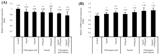 IL8 and TIMP2 regulatory effects of chlorogenic acid and taurine in cultured HaCaT cells. The synergistic effect of chlorogenic acid and taurine on (A) IL8 inhibition, and (B) TIMP2 activation after 24 h of co-treatment with heat-killed C. acnes. * p < 0.05, ** p < 0.01, *** p < 0.001 relative to the control group; Student’s t-test. Data are expressed as mean ± SEM.