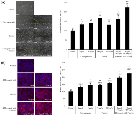 In addition, co-treatment results showed a wound closure area of 162% and 223% after the administration of 5 μg/mL and 500 μg/mL, and 10 μg/mL and 1000 μg/mL of chlorogenic acid and taurine, respectively (Figure 3A).