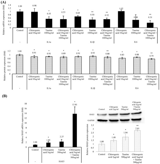 Regulatory effects of chlorogenic acid and taurine on inflammatory cytokines and hydration markers. Treatment with chlorogenic acid and taurine for 24 h (A) decreased the mRNA and protein expression level of IL1α, IL1β, and IL6, and (B) increased mRNA and protein expression of HAS3 in cultured HaCaT cells. * p < 0.05, ** p < 0.01 relative to the control group; Student’s t-test. Data are expressed as mean ± SEM.