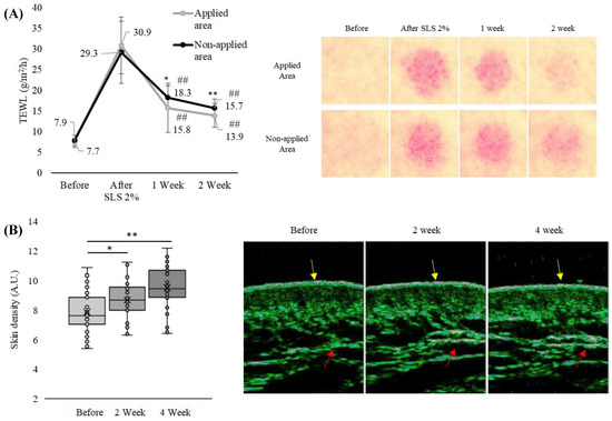 Attenuation of irritated epidermis and enhancement of dermal density by treatment of chlorogenic acid and taurine. (A) The restorative effect of chlorogenic acid and taurine on an SLS-induced skin wound. ## p < 0.01 relative to treatment with SLS. * p < 0.05, ** p < 0.01 comparing the SLS applied and non-applied group. (B) Increment in epidermal and dermal density by long-term treatment of chlorogenic acid and taurine (yellow arrows: epidermis, red arrows: dermis).* p < 0.05, ** p < 0.01 versus before group; Student’s t-test. Data are expressed as mean ± SEM.