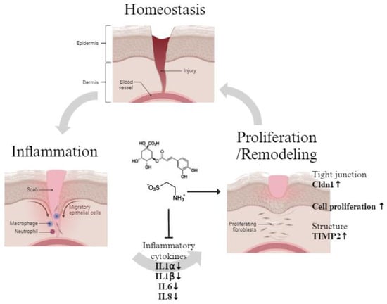 We investigated the wound-healing potential of two promising natural compounds. Inspired by acne scar treatment, we initially screened the in vitro efficacy of various natural compounds and subsequently selected chlorogenic acid and taurine due to their synergistic effects. Our findings suggest that combinatorial treatment with these two substances effectively promotes skin wound healing by suppressing the inflammatory reaction, an early step in the wound-healing process, and activating proliferation and remodeling [41] (Figure 6). Although further research is needed to elucidate their precise functions, this study demonstrates the potential of chlorogenic acid and taurine as wound-healing activators.