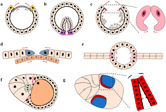 The dorsal vessel, the heart of Drosophila, is a simple linear tube that resembles the vertebrate heart at an early stage of development. The morphogenesis of the dorsal vessel during Drosophila embryonic development also exemplifies the classic process of tissue closure. Shortly after gastrulation, the mesodermal cell mass spreads laterally and arranges itself into a monolayer beneath the ectoderm. Mesodermal cells that migrate to the most dorsal region of the embryo develop into cardiac progenitor cells and then differentiate into cardioblasts and pericardial cells [35,36]. During the process of DC, the cardiac progenitor cells from either side of the embryo approach each other at the dorsal midline. Those cells first establish dorsal contacts with the contralateral counterpart and then undergo cell shape changes to make ventrally contacts, resulting in the formation of a continuous heart tube along the anterior–posterior axis (Figure 1c) [35,36,37,38].