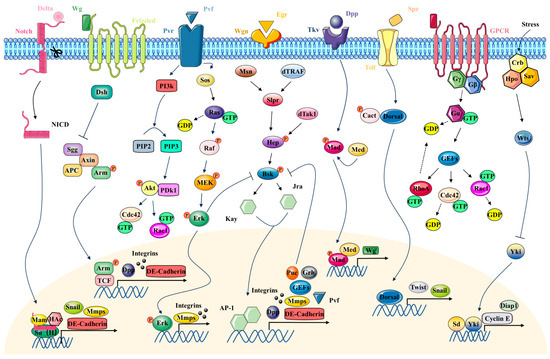 - Ishimaru, S.; Ueda, R.; Hinohara, Y.; Ohtani, M.; Hanafusa, H. PVR plays a critical role via JNK activation in thorax closure during Drosophila metamorphosis. EMBO J. 2004, 23, 3984–3994. [Google Scholar] [CrossRef]