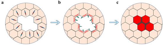 Wound healing in Drosophila. (a) Initial wound response: epidermal cells (compass) around the wound transit from a quiescent to a motile state. (b) Formation of actomyosin cable (red) and cellular protrusions (blue) and migration of epidermal cells around the wound. (c) Completion of wound healing: complete covering of the wound by the migrating epithelial cells (red), restoring the integrity of the epidermis.