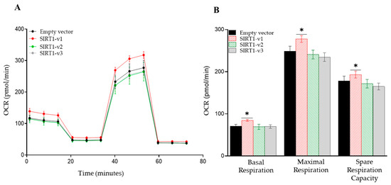 Additionally, the SIRT1-v1 isoform significantly reduced the basal glycolysis (p < 0.05, n = 3) and the compensatory glycolysis (p < 0.05, n = 3) (Figure 3C,D). Isoform v2 did not change the basal glycolysis (Figure 3C,D) or the compensatory glycolysis (Figure 3C,D). Isoform v3 did not change the basal glycolysis or the compensatory glycolysis either (Figure 3C,D).