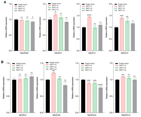 SIRT1-v1 transfection significantly upregulated the subunits NDUFS1 (p < 0.05, n = 3), NDUFV1 (p < 0.0001, n = 3), NDUFV2 (p < 0.001, n = 3), NDUFA5 (p < 0.01, n = 3), and NDUFA12 (p < 0.01, n = 3). The SIRT1-v1 isoform downregulated the subunit NDUFA10 (p < 0.001, n = 3), but did not affect the NDUFA1, NDUFA10, NDUFB11, and NDUFC2 subunits. SIRT1-v2 upregulated NDUFV2 (p < 0.01, n = 3), but downregulated NDUFV2 (p < 0.01, N = 3), NDUFA10 (p < 0.001, n = 3), NDUFB10 (p < 0.001, n = 3), and NDUFB11 (p < 0.05, n = 3). The SIRT1-v3 isoform upregulated NDUFV2 (p < 0.05, n = 3), but downregulated NDUFAB1 (p < 0.05, n = 3), NDUFA10 (p < 0.0001, n = 3), NDUFB10 (p < 0.001, n = 3), NDUFB11 (p < 0.05, n = 3), and NDUFC2 (p < 0.001, n = 3) (Figure 5).