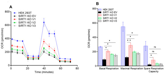 The sirtuin-1 (SIRT1) protein is an NAD+-dependent deacetylase that regulates cellular function through deacetylation of its target proteins. SIRT1 deacetylates the histone proteins and changes the chromatin architecture and structure that control transcriptional regulation and gene expression [9,10,11]. SIRT1 also regulates the signaling pathways leading to mitochondrial biogenesis, mitochondrial gene expression, and mitochondrial function [12,13]. However, it has not been completely explored whether SIRT1 specifically targets one or more of the mitochondrial respiratory complexes, and whether the non-catalytic domain (e.g., the N-terminal domain) is required to maintain its regulatory function. The SIRT1 gene is a multi-exon gene that undergoes alternative splicing [14,15]. Exon-skipping has been observed in the alternatively spliced isoforms, which generates shorter isoforms that lack one or more exons [1]. Here, we examined the alternatively spliced isoforms SIRT1-v2 and SIRT1-v3 versus the constitutively spliced isoform (SIRT1-v1). The v2 and v3 isoforms have lost part of the N-terminal region that includes both the NLS1 and NLS2 nuclear localization sequences. These truncated SIRT1 isoforms are ideal tools to analyze the cellular function associated with domain losses. The data indicate that SIRT1-v1 significantly increases mitochondrial oxidative phosphorylation and especially upregulates mitochondrial respiratory complex I, without significantly affecting complexes II, III, and IV, whereas loss of the N-terminal region in v2 and v3 attenuates their function. The data indicate that partial domain loss in v2 and v3 attenuates their function in the regulation of mitochondrial oxidative phosphorylation, site-specific lysine acetylation, and mitochondrial gene expression.