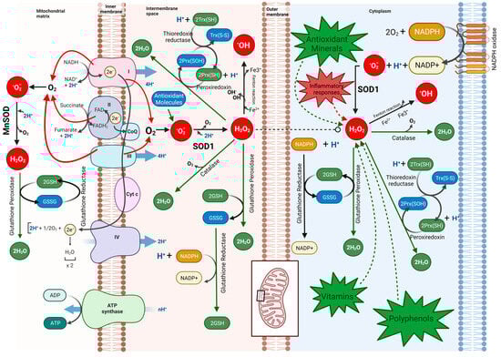ROS Generation and Neutralization Pathways. Several pathways govern the generation and regulation of ROS within cellular environments. Notably, the mitochondrial electron transport chain is a significant source of ROS production, where escaping electrons engage with molecular oxygen, culminating in the formation of ROS species including superoxide anion and hydrogen peroxide. Additionally, the activation of NADPH oxidases (NOX) is shown, with these enzymes transferring electrons from NADPH to molecular oxygen, resulting in the generation of superoxide. Counteracting the potentially detrimental effects of ROS, the figure portrays key defense mechanisms, encompassing ROS-scavenging enzymes such as superoxide dismutases (SODs), catalase, and glutathione peroxidases. SODs convert superoxide into less reactive hydrogen peroxide, while catalase reduces hydrogen peroxide to water and molecular oxygen, and glutathione peroxidases eliminate hydrogen peroxide using the reducing power derived from glutathione. Further defenses involve peroxiredoxins, the thioredoxin (TRX) system, and the glutathione/glutaredoxin system, which collectively collaborate to uphold an equilibrium of ROS levels. Additionally, vitamins, polyphenols, antioxidant minerals, and the glutathione pathway neutralize the ROS, significantly maintaining cellular health.