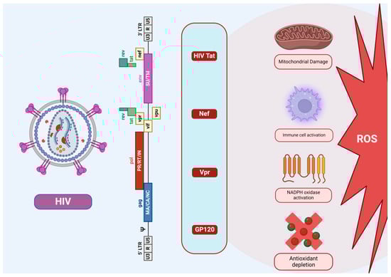 The dynamics of ROS generation in the HIV infection scenario have long been attributed to HIV proteins. Numerous lines of research investigations evidenced the association of HIV and its viral proteins with significant ROS elevation, in both HIV infected patients and cell models [30,31,32]. The HIV infection deregulates the OS pathways by escalating ROS production and instigating mitochondrial dysfunction through viral proteins, leading to the induction of OS in the host environment [33,34] (Figure 3). It remains highly plausible that several viral proteins are involved to influence the OS paradigm, and the viral proteins Glycoprotein 120 (GP120), Trans-Activator of Transcription (Tat), Negative Regulatory Factor (Nef), Viral Protein R (Vpr), and Reverse Transcriptase (RT) each exhibit variegated roles and mechanisms in the context of OS pathways, that are discussed in detail in the following sections (Figure 4).